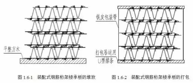钢筋桁架楼承板施工技术1、摆设装配支架,保证间距1米,高度一致,同一直线 。 2、将对应《钢筋桁架楼承板装配图》中的钢筋桁架依次放在装配支架的V槽内,确保钢筋桁架一端对齐。 3、检查钢筋桁架腹杆筋顶部的直线度,使腹杆筋顶部位置在同一直线上。 4、将对应的模板搬到已校准腹杆筋顶部直线度的桁架上,模板方向应正确,模板端部与钢筋桁架端部尺寸应符合装配图要求。 5、检查模板安装孔与腹杆筋位置适当后,穿入联接件并锁紧。联接件安装顺序应先将四角对称固定,然后固定中间,再固定其它安装孔。 6、联接件安装完后检查有无漏装、松动、密封垫使用错误,反面弯钩是否锁紧桁架腹杆筋等情况,确认符合要求后书写板号。 1、钢筋桁架楼承板应遵循相同规格同垛堆放的原则。堆放时两块板正反倒扣为一组,堆放在平整方木上,如图1.6-1所示。 2、如需打包堆放,应在顶部、底部设置U型撑条,如图1.6-2所示。堆叠高度不超过1.2m,且不超过7组。采用铁皮包扎,捆扎点间距不超过两米,每捆不少于两处。如需叠放,应采用缆绳将各捆之间有效连接,防止倒塌。为防变形,堆放不得超过三层。 3、存放应考虑起重机的操作范围,以减少二次倒运。 起吊时,钢筋桁架楼承板下面和上面应设带有U型卡口吊运木制撑条,防止钢筋桁架楼承板变形,偏斜等问题。吊装应设置两个吊装带,间距1.6m,吊装带应设在桁架中部,保持起吊过程中楼承板两端平衡。如图1.6-3所示。 一般要求 1、楼承板的钢筋桁架两端和中间临时支撑处,宜保证桁架腹杆下节点和支座钢筋放置于混凝土梁模板方木或钢梁翼缘之上。每块楼承板铺设、调整就位后,钢结构中应立即将所有的腹杆下节点或支座钢筋与钢梁焊牢。 2、根据设计图纸标记的位置,使得腹杆钢筋下节点支承在支撑的方木或钢管上。支撑立杆和水平杆的规格、间距应经过计算,支撑应满足强度和稳定性要求。如图1.6-4所示。 3、支座措施可采用几字型钢筋支座,工厂预制。几字型支座与桁架下弦钢筋点焊固定,与上弦钢筋顶紧。支座脚部与钢梁或支撑构件现场点焊。如图1.6-5所示。 4、当浇筑混凝土完成且强度达到1.2MPa后,可在本层混凝土表面测量放线,搭设上一层楼板的支撑立杆。立杆下端应垫方木或木板,避免损坏楼板混凝土。立面施工中,如有临时支撑,应至少保留三层。 5、装配式楼承板在安装过程中,应及时、准确的按照质量验收要求对每项工程进行验收和记录,否则不容许进行下一项工作内容。 钢结构中的安装 1、楼承板铺设前,根据楼承板排板图和楼承板铺设方向,在支座钢梁上绘制第一块楼承板侧边不大于20mm的定位线(宜按排版图纸距离确定),保证标准模板侧边不与钢梁翼缘搭接;在楼承板起始端的钢梁翼缘上绘制钢筋桁架起始端50mm基准线(点)。如图1.6-6所示。 2、钢柱处,楼承板模板按设计图纸在工厂切去与钢柱碰撞部分。楼承板模板与支承角钢的连接,采用封边条的方式。封边条与模板用拉铆钉固定,封边条与支承角钢用点焊固定。如图1.6-7所示。 3、按照设计图纸中楼承板的铺设方向,对准基准线(点),安装第一块楼承板。严格保证第一块楼承板模板侧边基准线重合。模板端部与钢梁翼缘之间的空隙距离由排板图定。空隙采用堵缝措施处理。 4、放置钢筋桁架时,先确定一端支座为起始端,钢筋桁架端部伸入钢梁内的距离应符合设计图纸要求,且不小于50mm。钢筋桁架另一端伸入梁内长度不小于50mm。钢筋桁架端部节点构造如图1.6-8所示。钢筋桁架两端的腹杆下节点应搁置在钢梁上,搁置距离不小于20mm,无法满足时,应设置可靠的端部支座措施。 5、连续板中间钢梁处,钢筋桁架腹杆下节点应放置于钢梁上翼缘,下节点距离钢梁上翼缘边不小于10mm。无法满足时,应设置可靠的中间支座措施。 6、按照设计图纸的楼承板铺设方向,依次安装其它楼承板,模板与模板之间距离应保持均匀。两块楼承板模板就位后,在桁架两端用两块辅助定位木模板临时定位,保证楼承板模板搭接距离为20mm,随后点焊钢筋支座。支座固定后,将辅助定位木模板拆除,并重复使用。辅助定位木模板,可采用如图1.6-9所示 。 7、楼承板铺设一个区格后,应及时在各块楼承板模板搭接处,按间距200mm钻孔,并用拉铆钉固定,保证模板搭边处连接可靠。采用可靠的堵缝措施,保证楼承板模板与框架梁四周不漏浆。重复使用的模板,在满足间距的要求下,搭接处可在旧孔处拉铆钉固定。 8、楼承板模板与框架梁四周的缝隙,可采用收边条堵缝。收边条一边与模板按间距200mm拉铆钉固定,另一边与钢梁翼缘点焊,如图1.6-10所示。也可采用吊木模板进行堵缝,通过铁丝将木模板和钢筋桁架下部钢筋或木模板定位钢筋相连接。木模板与钢筋之间应填充模板水平定位垫块,保证模板水平和钢筋保护层厚度。 9、混凝土剪力墙处,应设置临时支撑或支承角钢。如采用临时支撑,应在铺板前设置,并与混凝土墙体可靠固定。楼板达到拆除条件后,拆除临时支撑和模板。如采用支承角钢,应在楼承板铺设前用膨胀螺栓将支承角钢与混凝土剪力墙固定或将支撑角钢焊接与预埋件上,支承角钢水平肢上表面标高与楼承板模板标高一致。楼承板模板与支承角钢的连接,可采用与钢柱处相同的处理方式。 10、局部升板、降板处,如钢梁上已经设计托板,楼承板应铺设在托板上,托板处的堵缝方